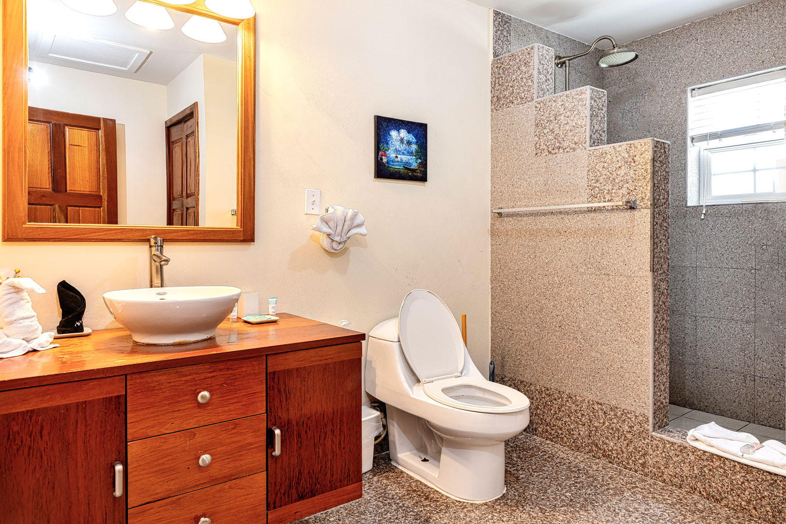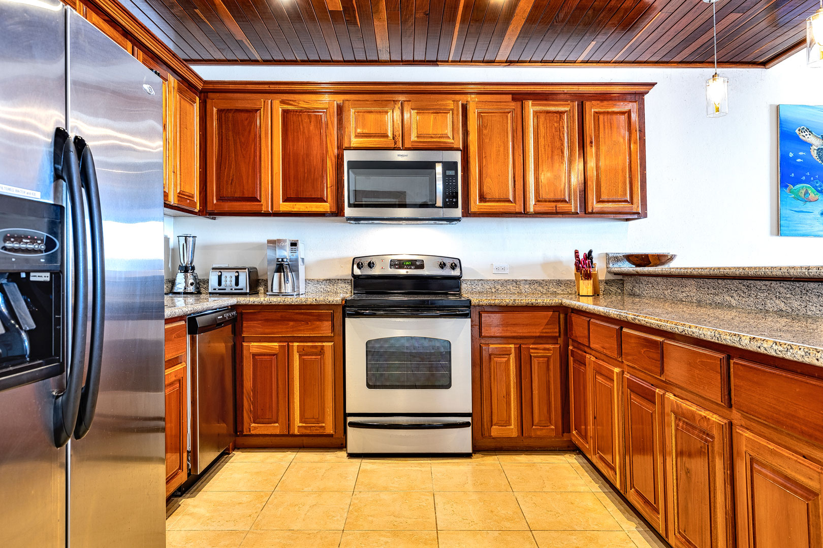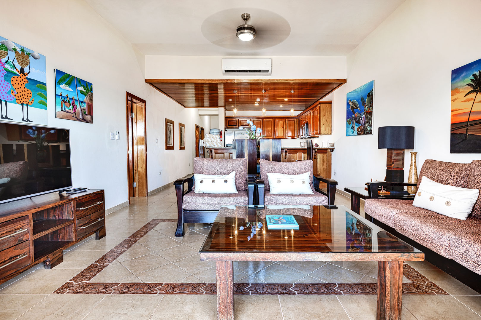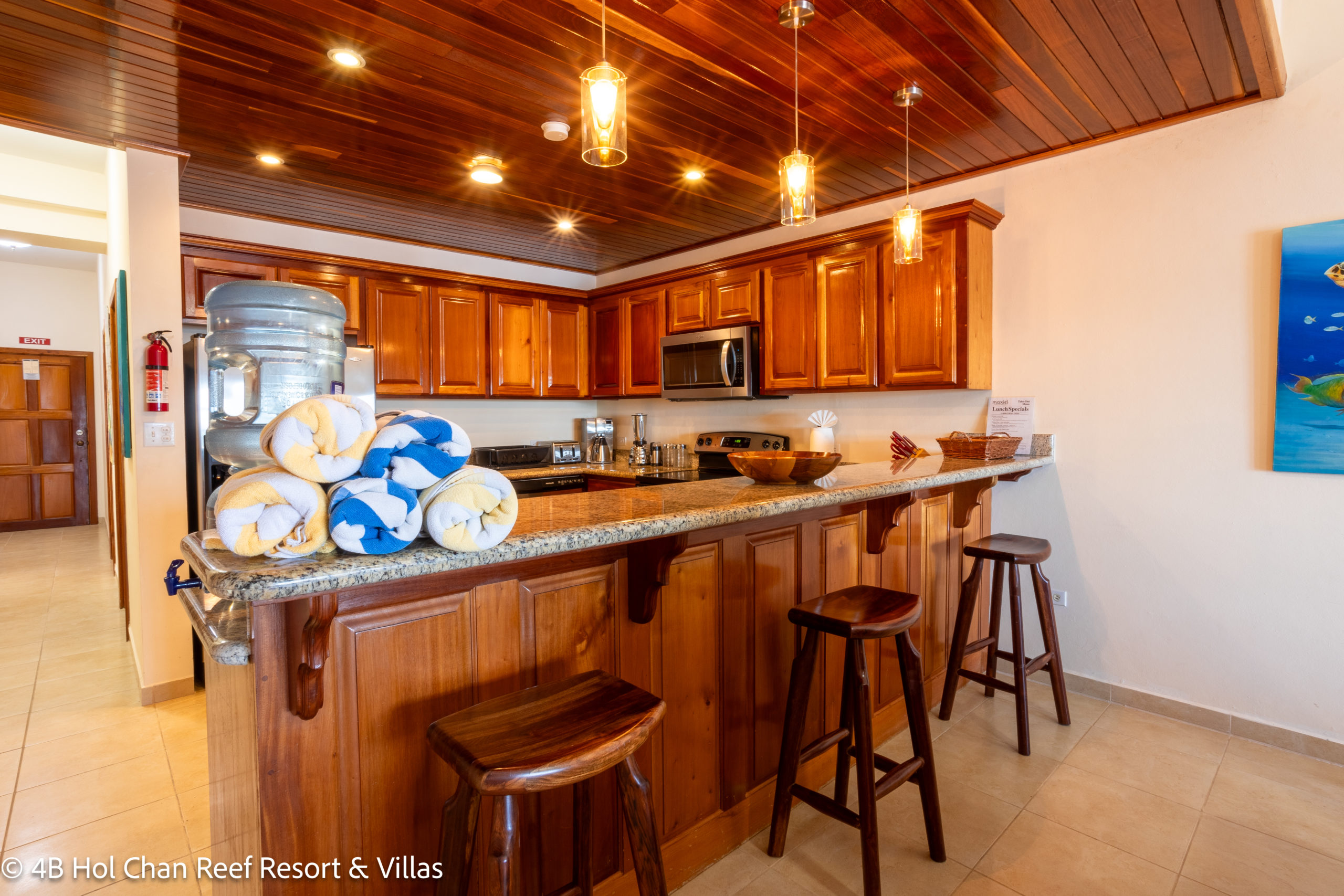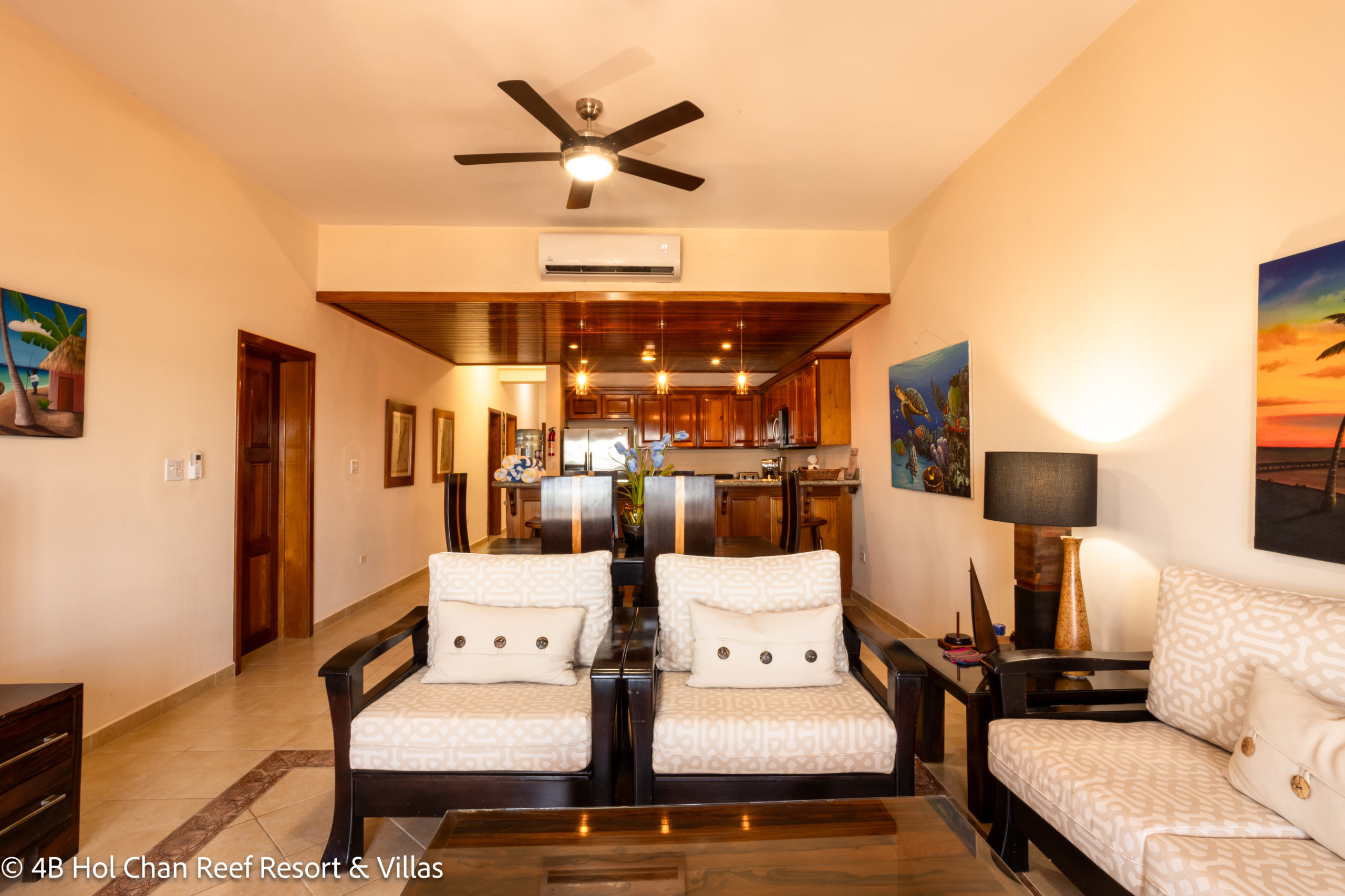 YOUR UNBELIZEABLE VACATION AWAITS AT DE LA ISLA BONITA! At La Isla Bonita, you will enjoy panoramic views of the Caribbean Sea from your penthouse home! Start your morning right by relaxing on your private balcony sipping your morning coffee overlooking the beach as you feel the gentle warm breeze of the Caribbean Sea. De La Isla Bonita is able to sleep 6 guests with its three bedrooms and two bathrooms. The master bedroom comes with its own private balcony, an ensuite bathroom, and a king-sized bed. The second bedroom features a queen-sized bed and the third bedroom has two twin beds which can be configured as a king. The second bathroom is conveniently located next to the bedrooms. The glass French doors allow for plenty of natural sunlight to the entire luxury penthouse home enhancing the carefully curated art which highlights the diverse landscapes and cultures found throughout Belize. Beautiful hand-crafted mahogany furniture enhance the unique cultural elements found in Belize. De La Isla Bonita has a fully stocked kitchen and is made of beautifully crafted Belizean hardwood and modern elements like stainless steel appliances and granite counter tops that provides a unique blend of historical and modern charm. Bring out the foodie in you and be inspired by the diverse food options found in Belize as you create your own meals using locally sourced and organic ingredients.